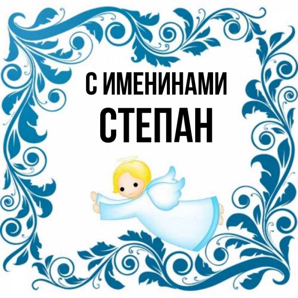 Открытка С именинами Степан. летящий ангел в рамочке. девочка ангел и синяя рамка