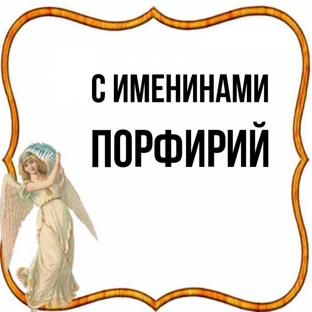 Открытка С именинами Порфирий. женщина ангел с крыльями. рамочка простая