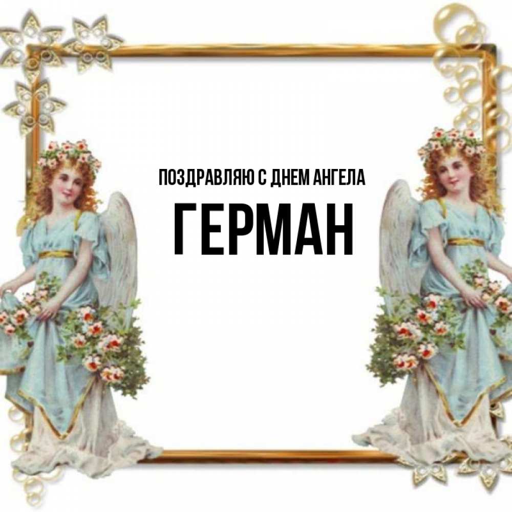 Открытка Поздравляю с днем Ангела Герман. Красивая открытка с ангелами. рамочка из золота и ангелы