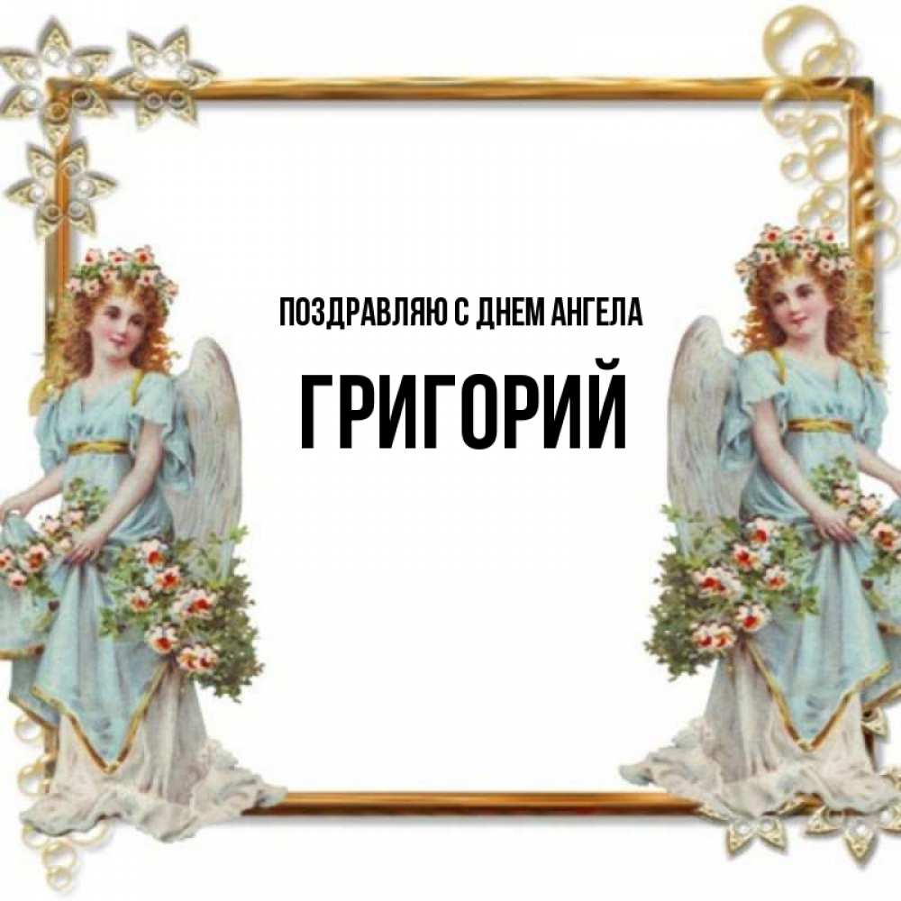 Открытка Поздравляю с днем Ангела Григорий. Красивая открытка с ангелами. рамочка из золота и ангелы