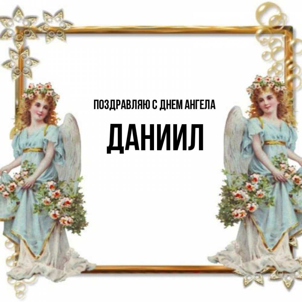 Открытка Поздравляю с днем Ангела Даниил. Красивая открытка с ангелами. рамочка из золота и ангелы