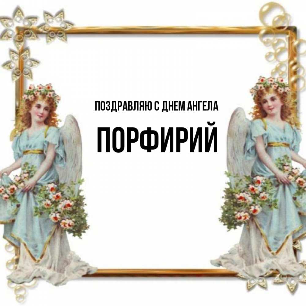 Открытка Поздравляю с днем Ангела Порфирий. Красивая открытка с ангелами. рамочка из золота и ангелы