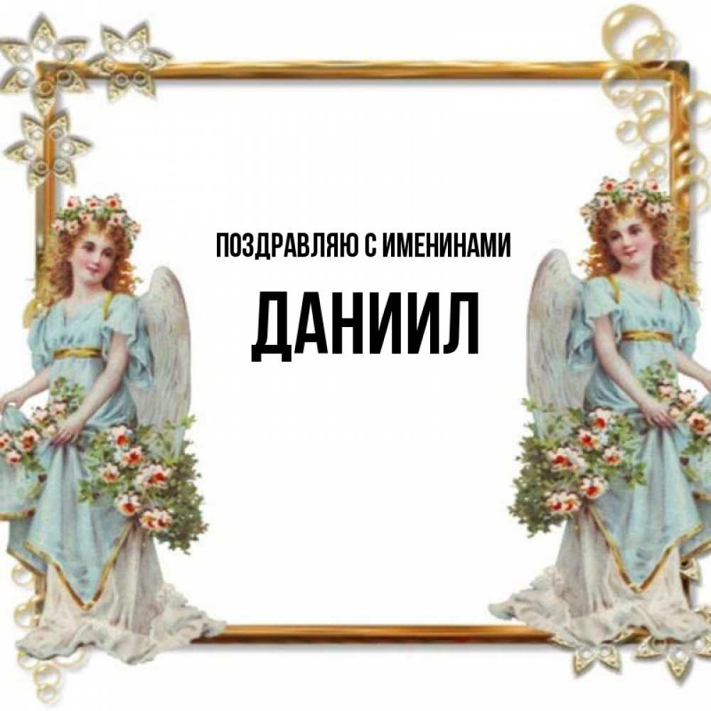 Открытка Поздравляю с именинами Даниил. Красивая открытка с ангелами. рамочка из золота и ангелы