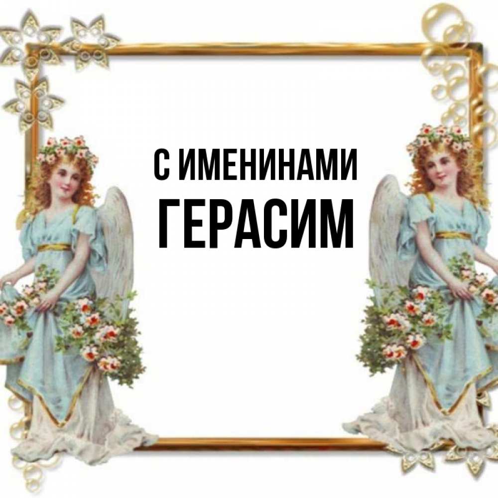 Открытка С именинами Герасим. Красивая открытка с ангелами. рамочка из золота и ангелы