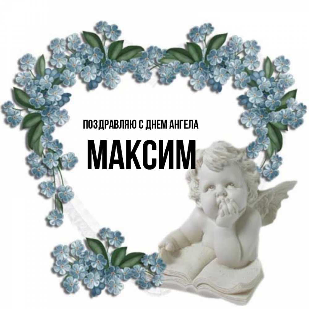 Открытка Поздравляю с днем Ангела Максим. ангел задумался. голубые цветы и мраморный ангел