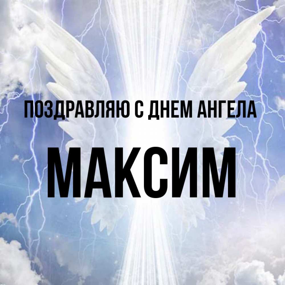 Открытка Поздравляю с днем Ангела Максим. Ангельские крылья. молнии на небе и свет