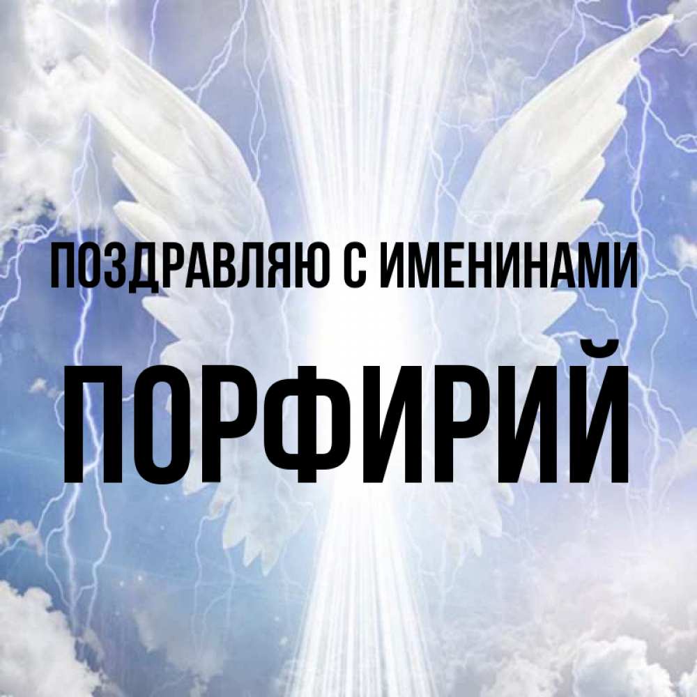Открытка Поздравляю с именинами Порфирий. Ангельские крылья. молнии на небе и свет