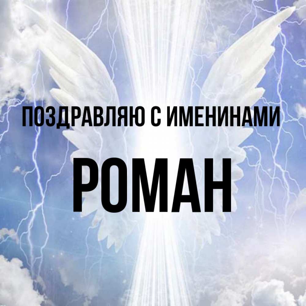 Открытка Поздравляю с именинами Роман. Ангельские крылья. молнии на небе и свет