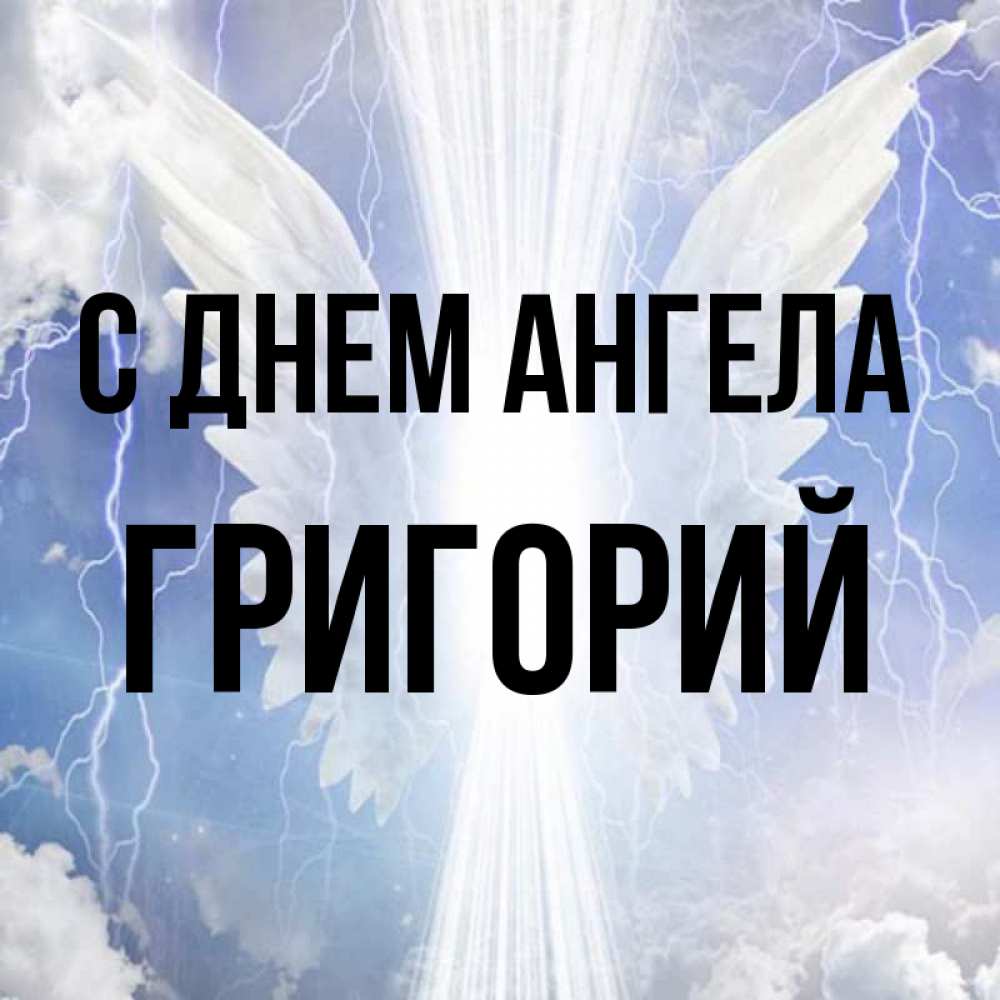 Открытка С днем Ангела Григорий. Ангельские крылья. молнии на небе и свет