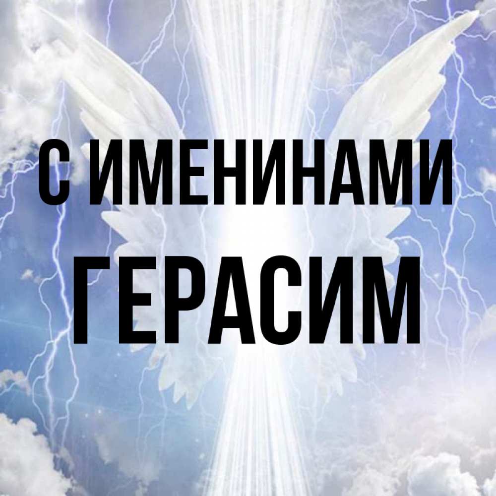 Открытка С именинами Герасим. Ангельские крылья. молнии на небе и свет