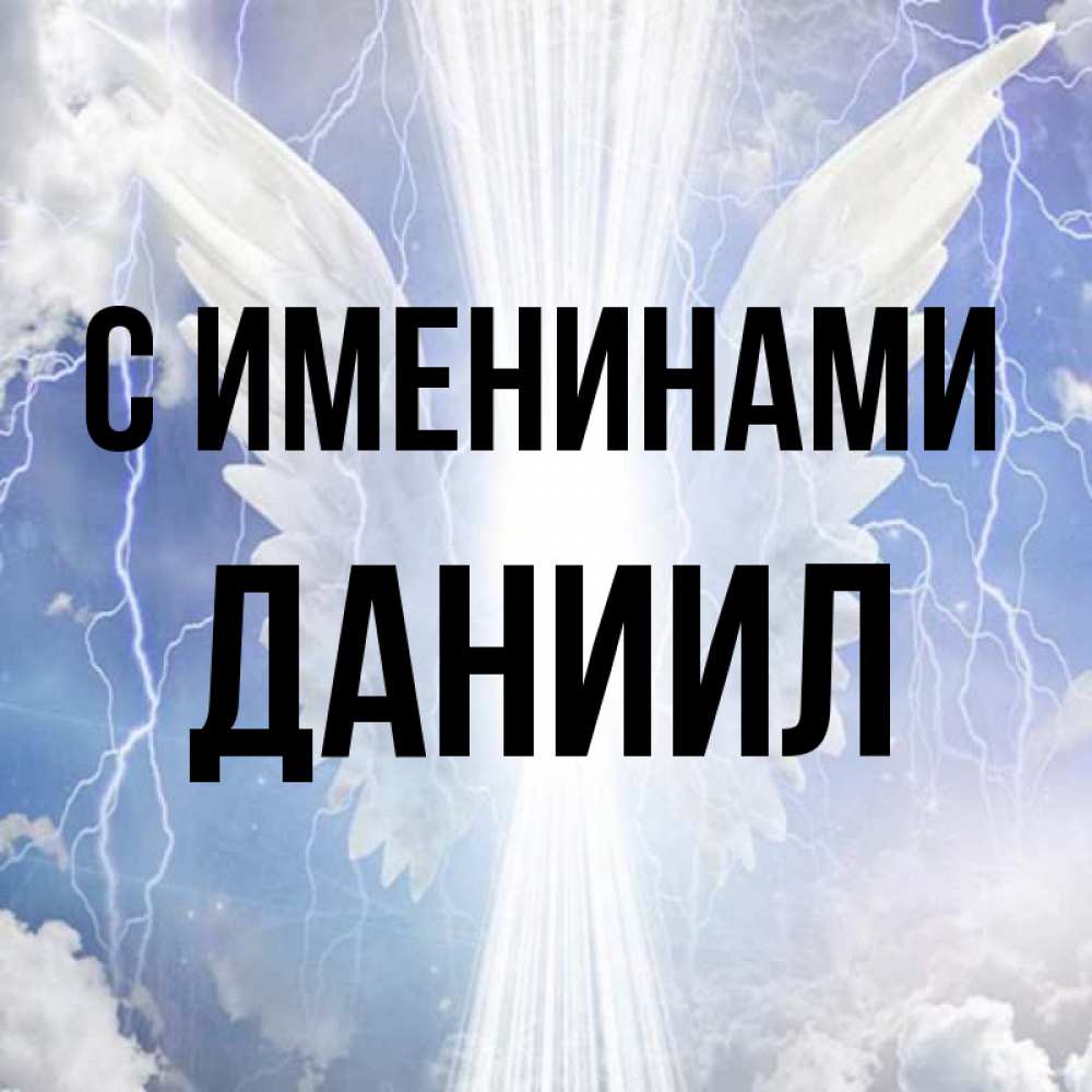 Открытка С именинами Даниил. Ангельские крылья. молнии на небе и свет