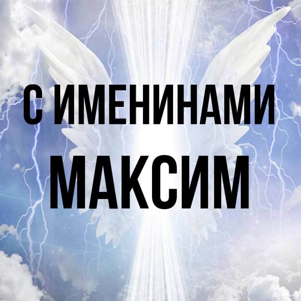 Открытка С именинами Максим. Ангельские крылья. молнии на небе и свет
