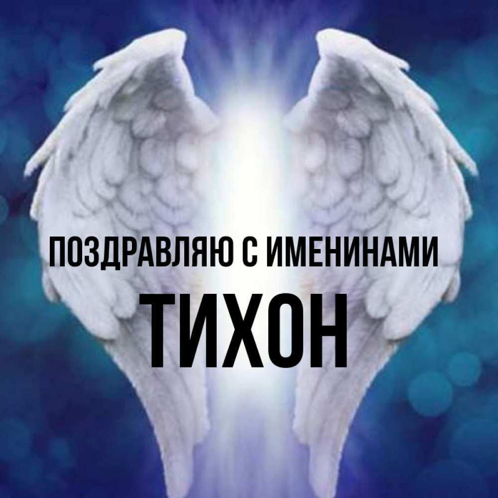 Открытка Поздравляю с именинами Тихон. крылья ангела. синий фон и крылышки