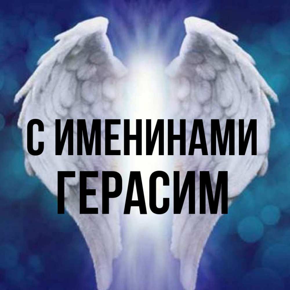Открытка С именинами Герасим. крылья ангела. синий фон и крылышки