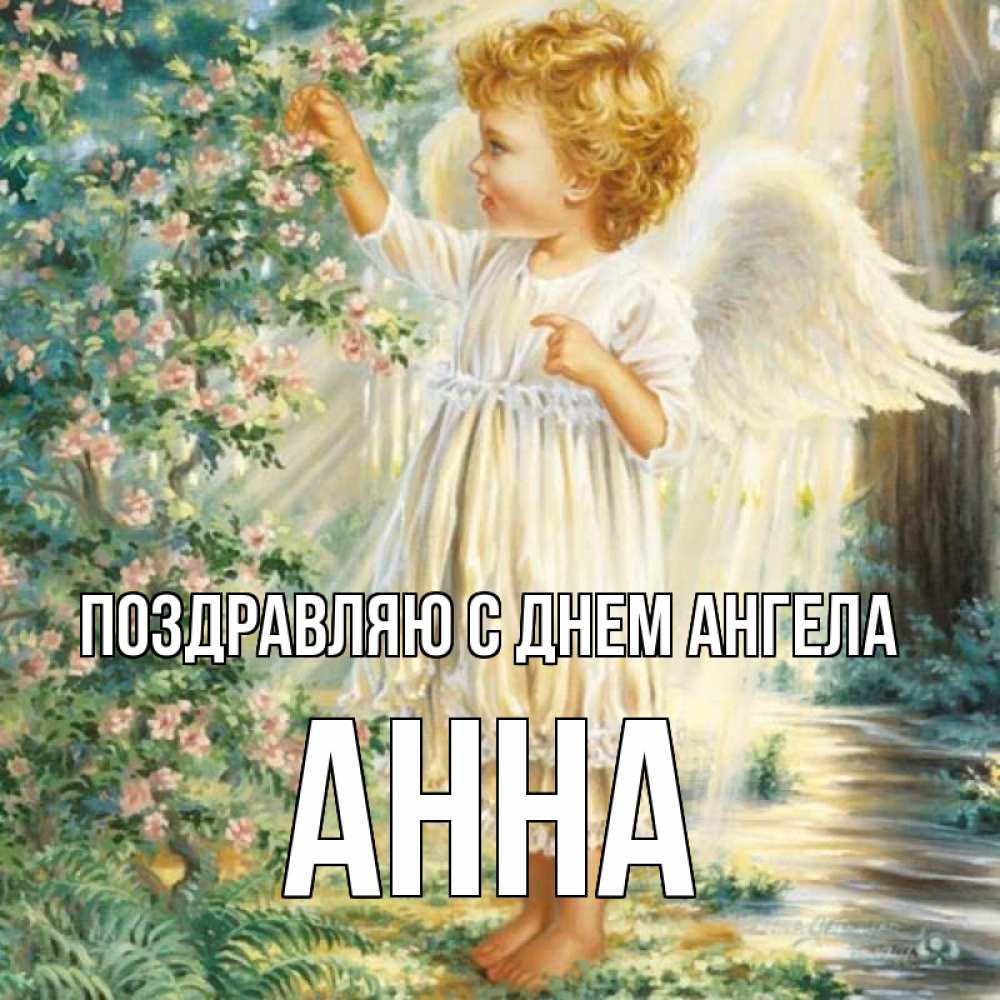 Открытка Поздравляю с днем Ангела Анна. ребенок ангел. собирает цветы