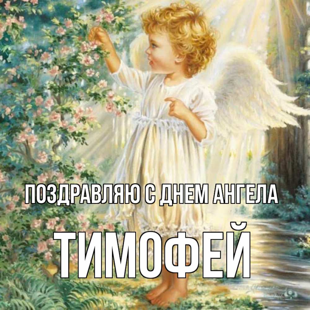 Открытка Поздравляю с днем Ангела Тимофей. ребенок ангел. собирает цветы