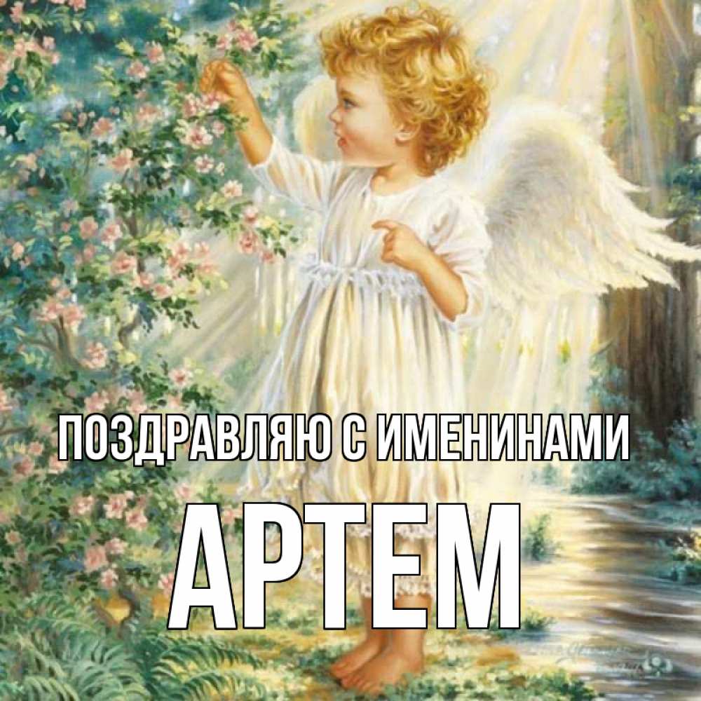 Открытка Поздравляю с именинами Артем. ребенок ангел. собирает цветы