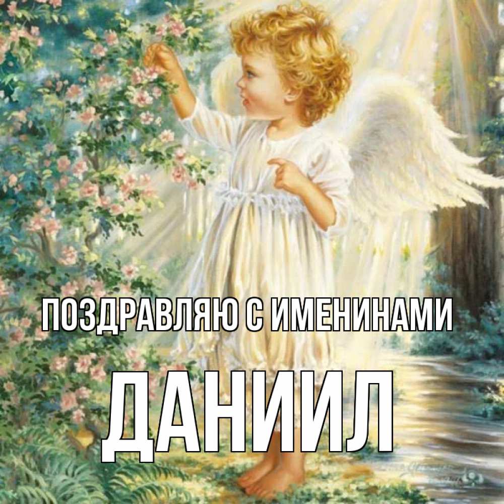 Открытка Поздравляю с именинами Даниил. ребенок ангел. собирает цветы