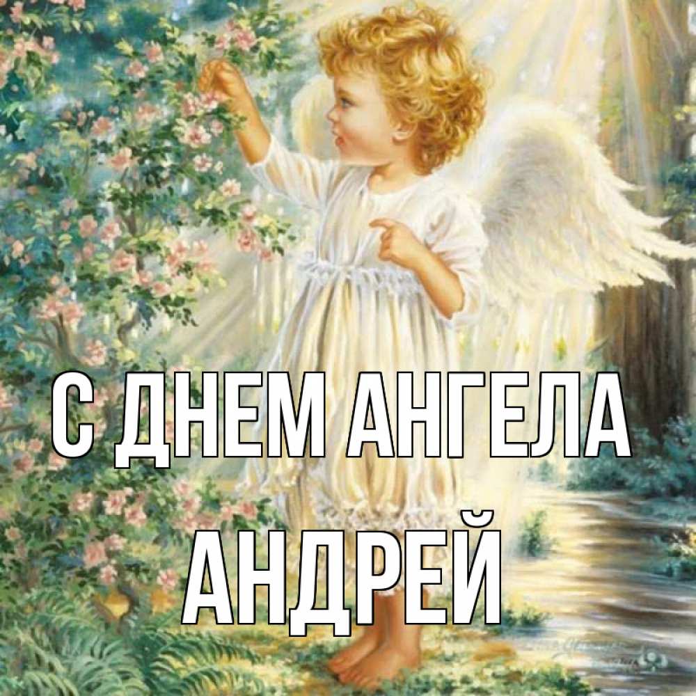 Открытка С днем Ангела Андрей. ребенок ангел. собирает цветы