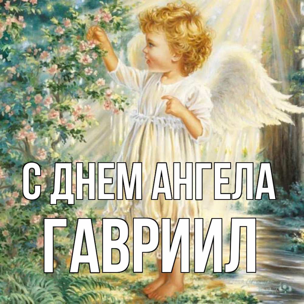 Открытка С днем Ангела Гавриил. ребенок ангел. собирает цветы