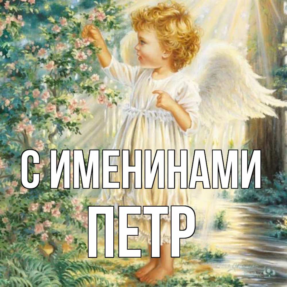 Открытка С именинами Петр. ребенок ангел. собирает цветы