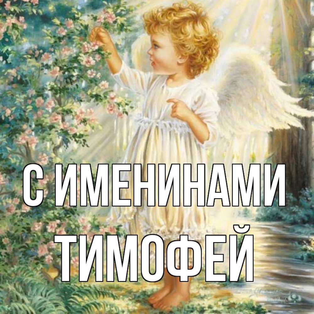 Открытка С именинами Тимофей. ребенок ангел. собирает цветы