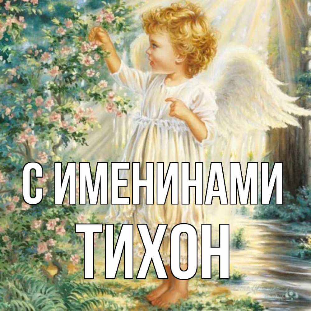 Открытка С именинами Тихон. ребенок ангел. собирает цветы
