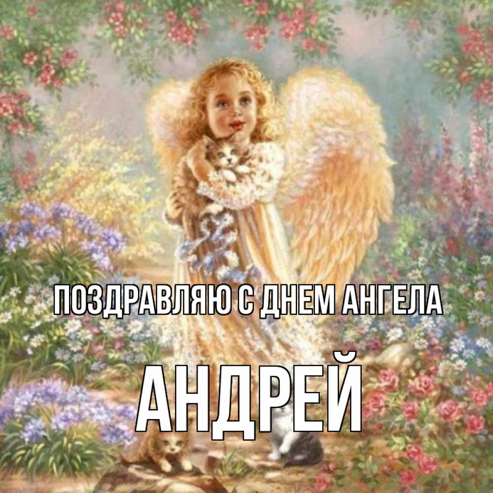 Открытка Поздравляю с днем Ангела Андрей. девочка с крыльями. держит котенка