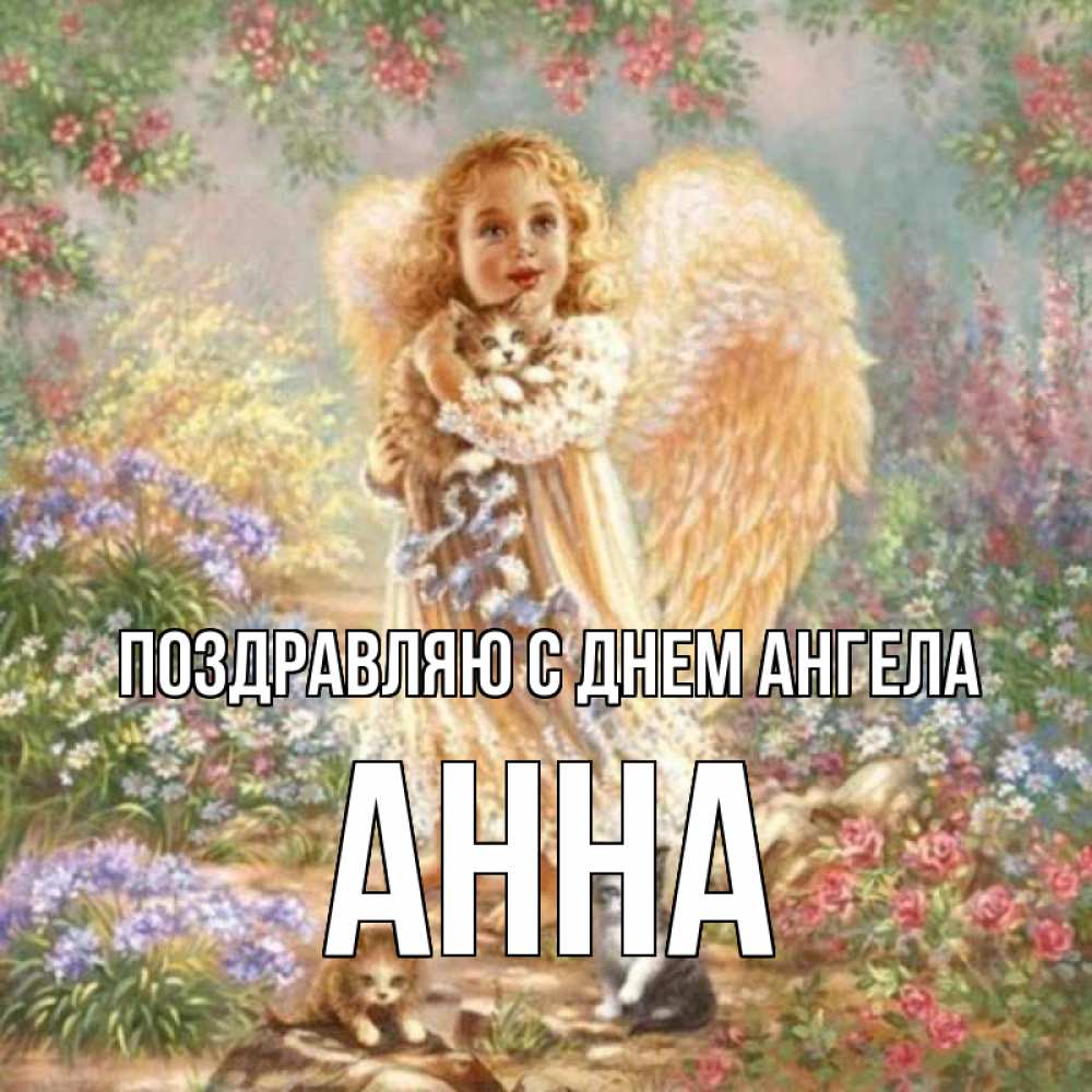 Открытка Поздравляю с днем Ангела Анна. девочка с крыльями. держит котенка