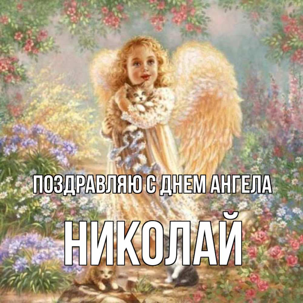 Открытка Поздравляю с днем Ангела Николай. девочка с крыльями. держит котенка