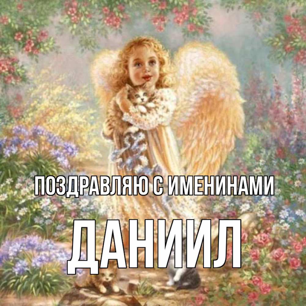 Открытка Поздравляю с именинами Даниил. девочка с крыльями. держит котенка