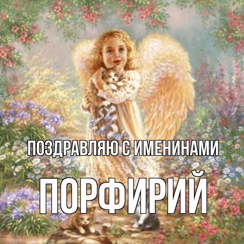 Открытка Поздравляю с именинами Порфирий. девочка с крыльями. держит котенка