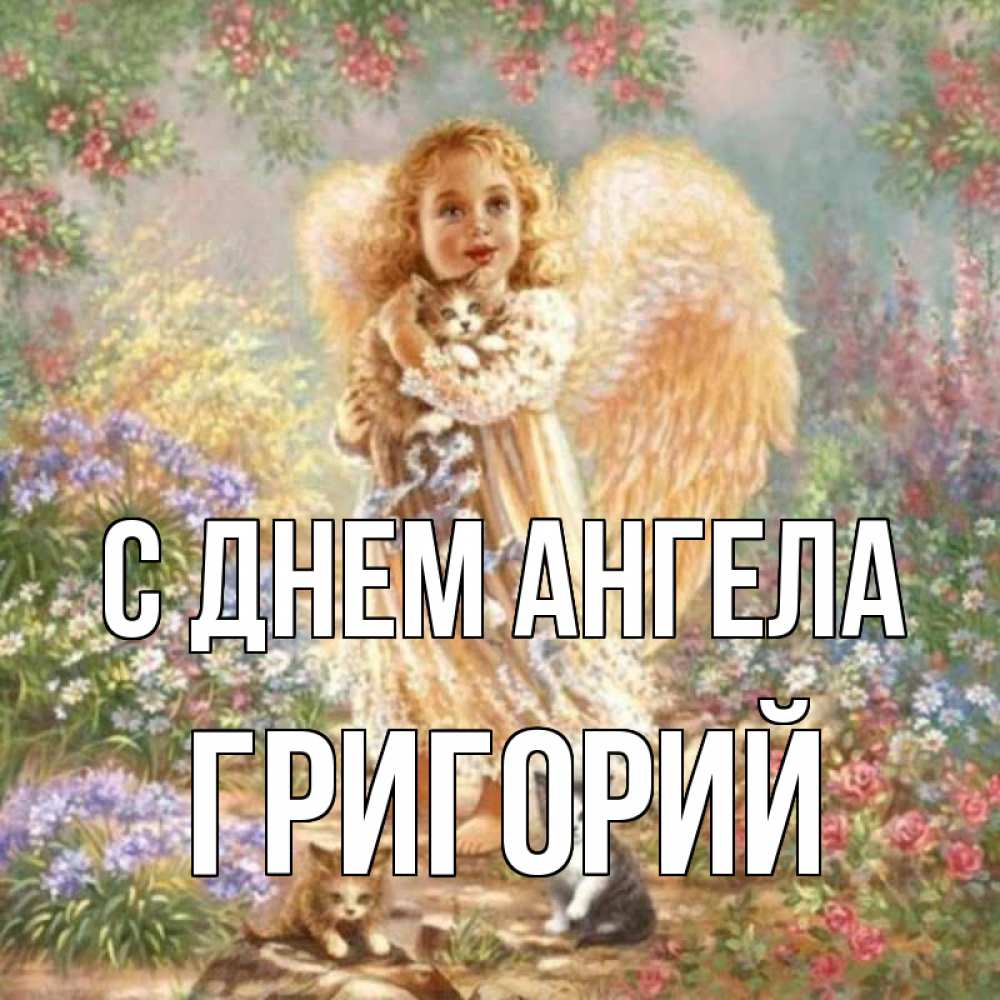 Открытка С днем Ангела Григорий. девочка с крыльями. держит котенка