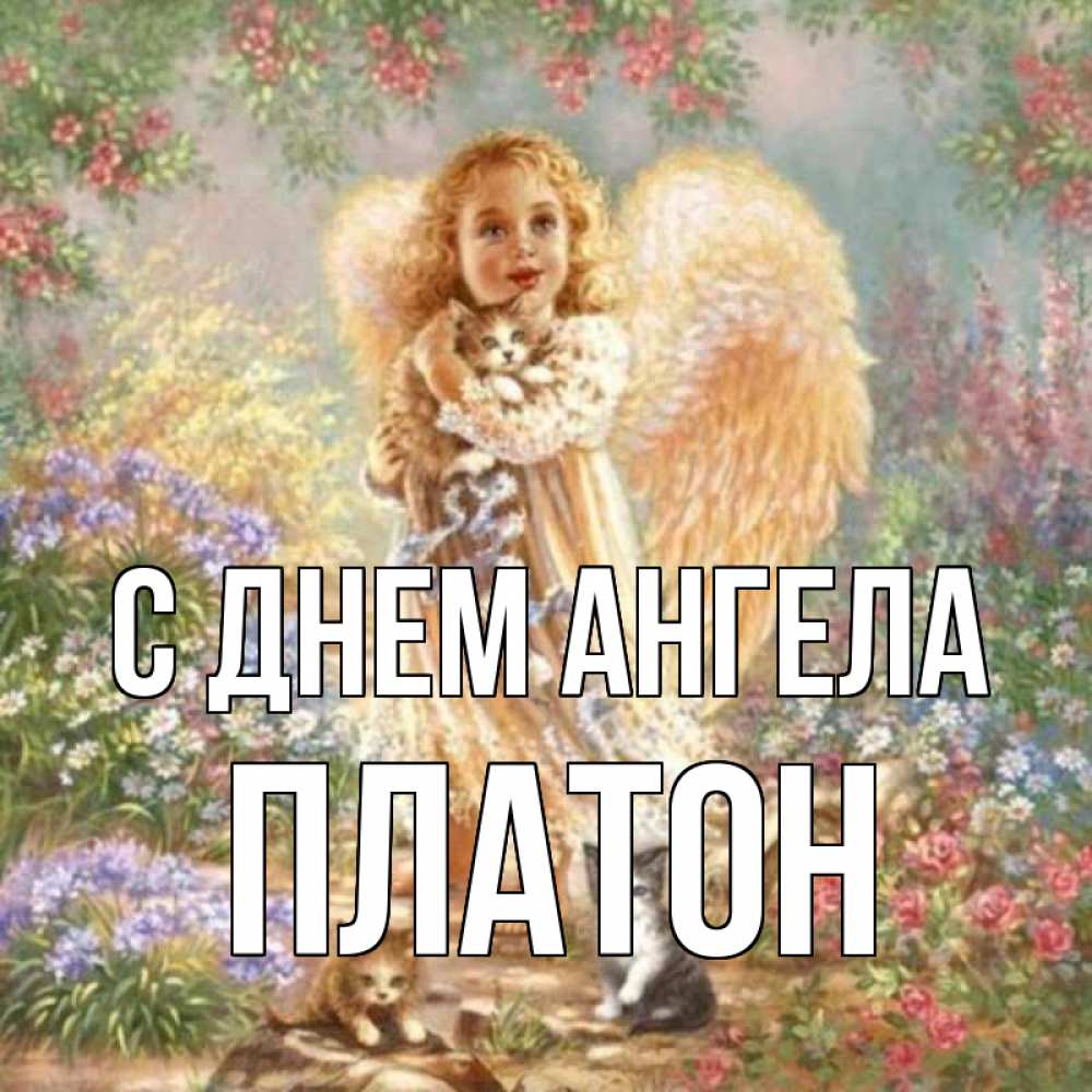 Открытка С днем Ангела Платон. девочка с крыльями. держит котенка