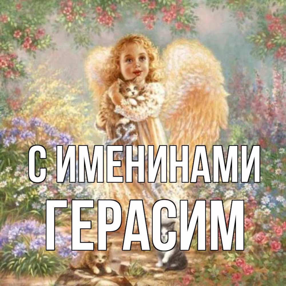 Открытка С именинами Герасим. девочка с крыльями. держит котенка