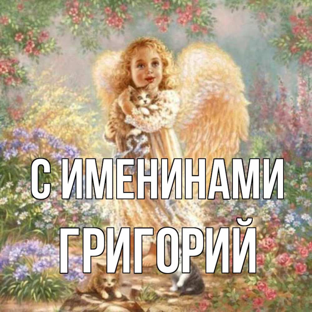 Открытка С именинами Григорий. девочка с крыльями. держит котенка