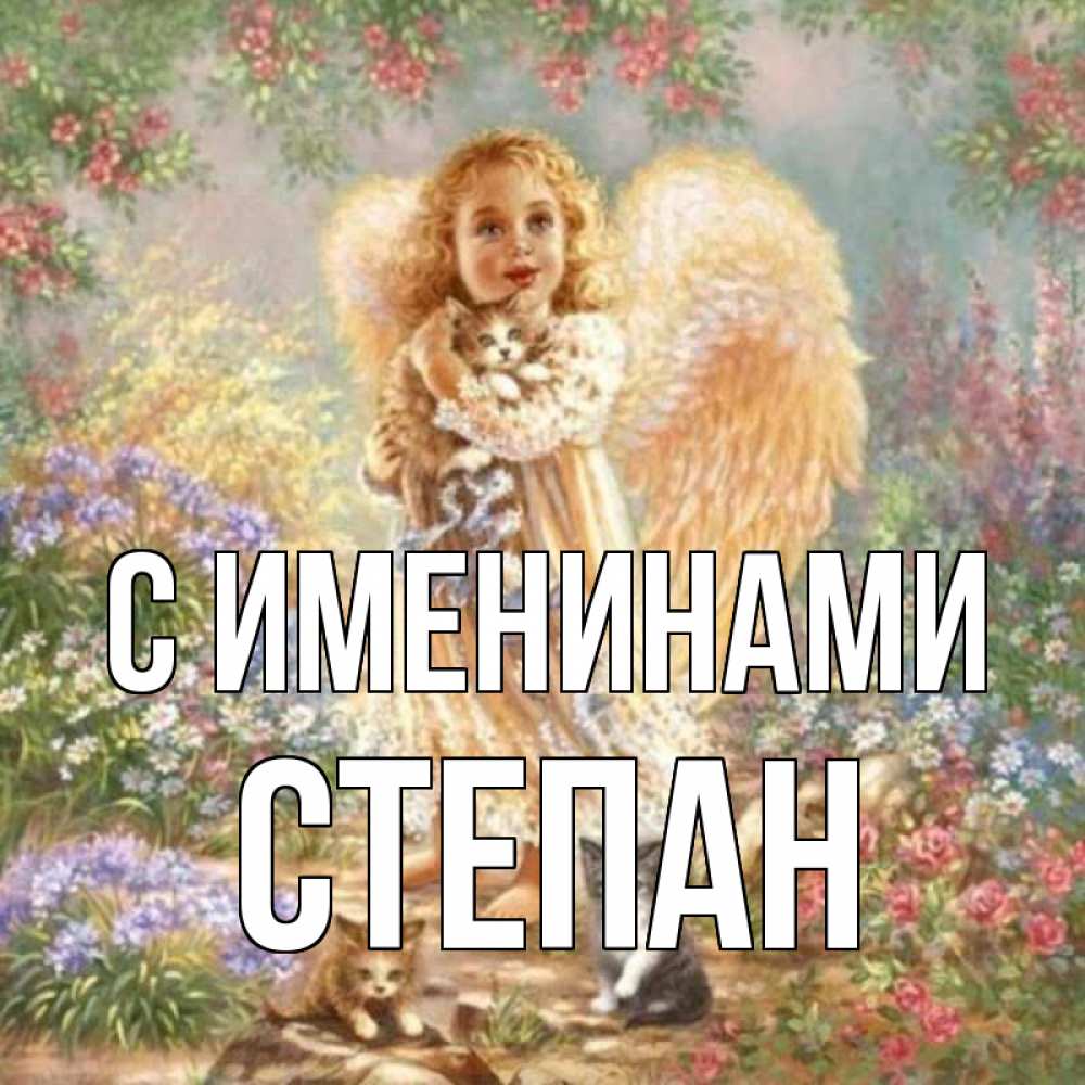 Открытка С именинами Степан. девочка с крыльями. держит котенка