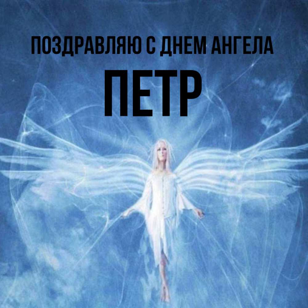 Открытка Поздравляю с днем Ангела Петр. ангел с длинными крыльями. голубой фон и крылья как у стрекозы