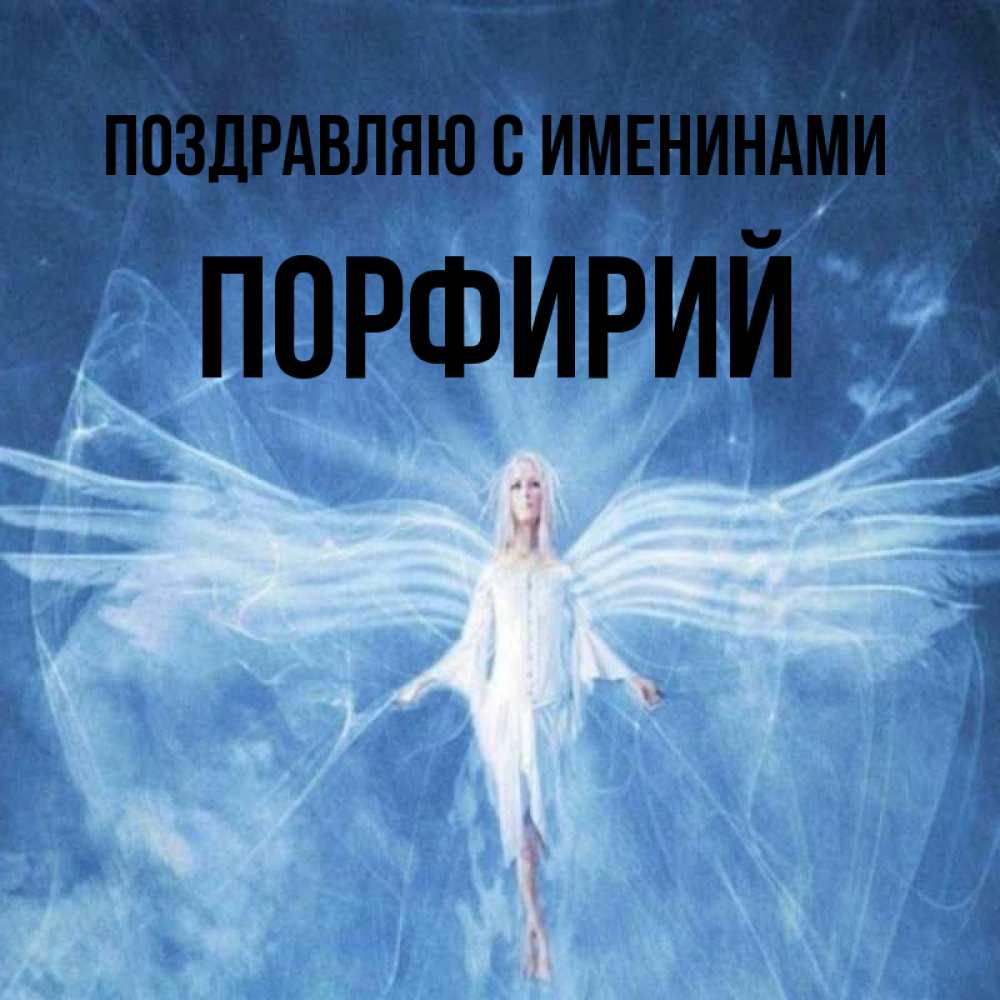 Открытка Поздравляю с именинами Порфирий. ангел с длинными крыльями. голубой фон и крылья как у стрекозы