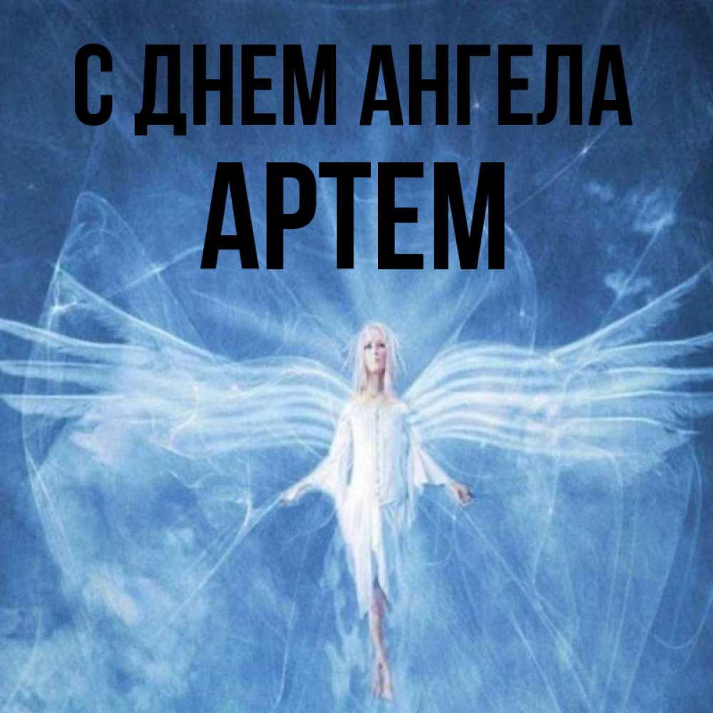 Открытка С днем Ангела Артем. ангел с длинными крыльями. голубой фон и крылья как у стрекозы