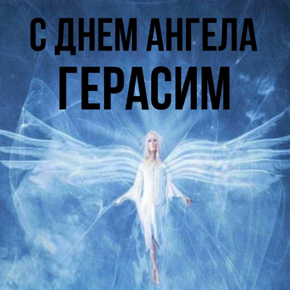 Открытка С днем Ангела Герасим. ангел с длинными крыльями. голубой фон и крылья как у стрекозы