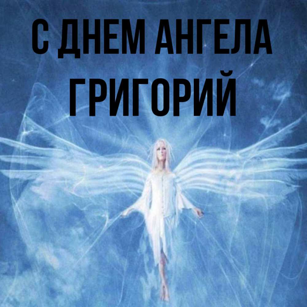 Открытка С днем Ангела Григорий. ангел с длинными крыльями. голубой фон и крылья как у стрекозы