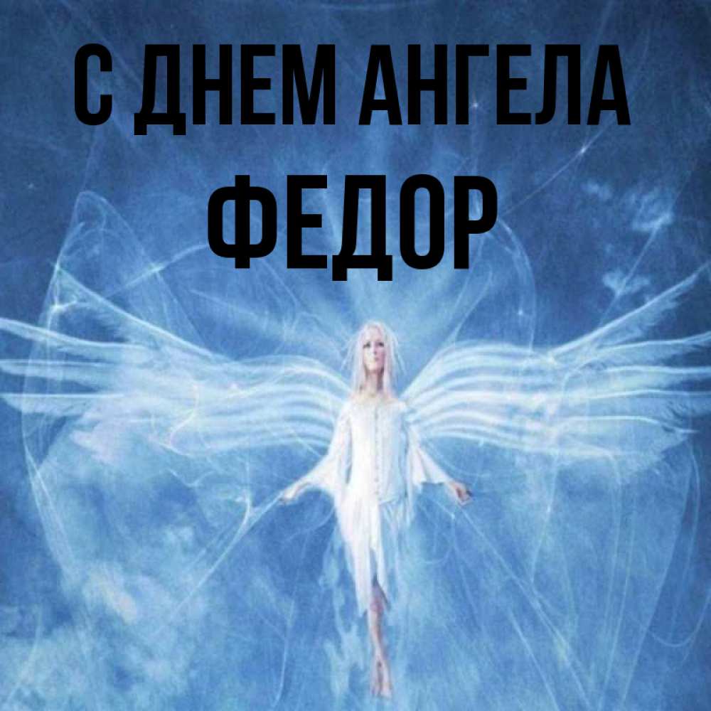 Открытка С днем Ангела Федор. ангел с длинными крыльями. голубой фон и крылья как у стрекозы