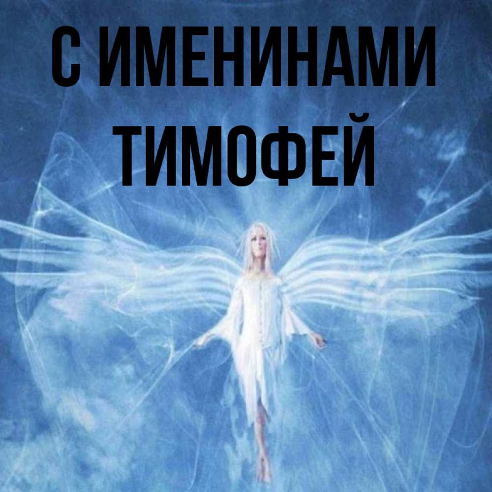 Открытка С именинами Тимофей. ангел с длинными крыльями. голубой фон и крылья как у стрекозы