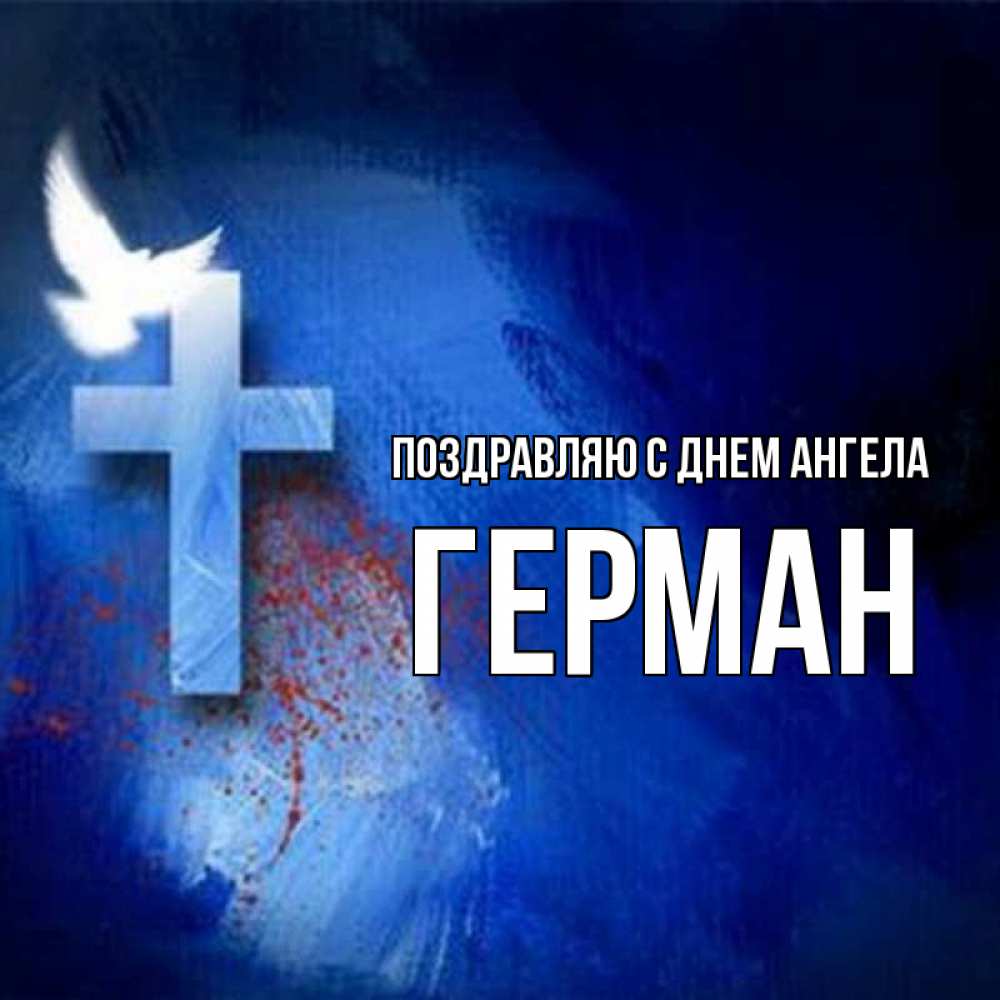Открытка Поздравляю с днем Ангела Герман. Голубь и крест. Синий фон и птица