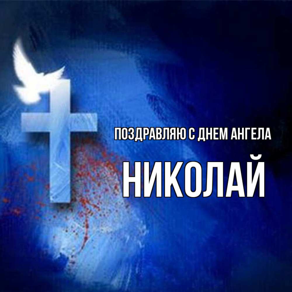 Открытка Поздравляю с днем Ангела Николай. Голубь и крест. Синий фон и птица
