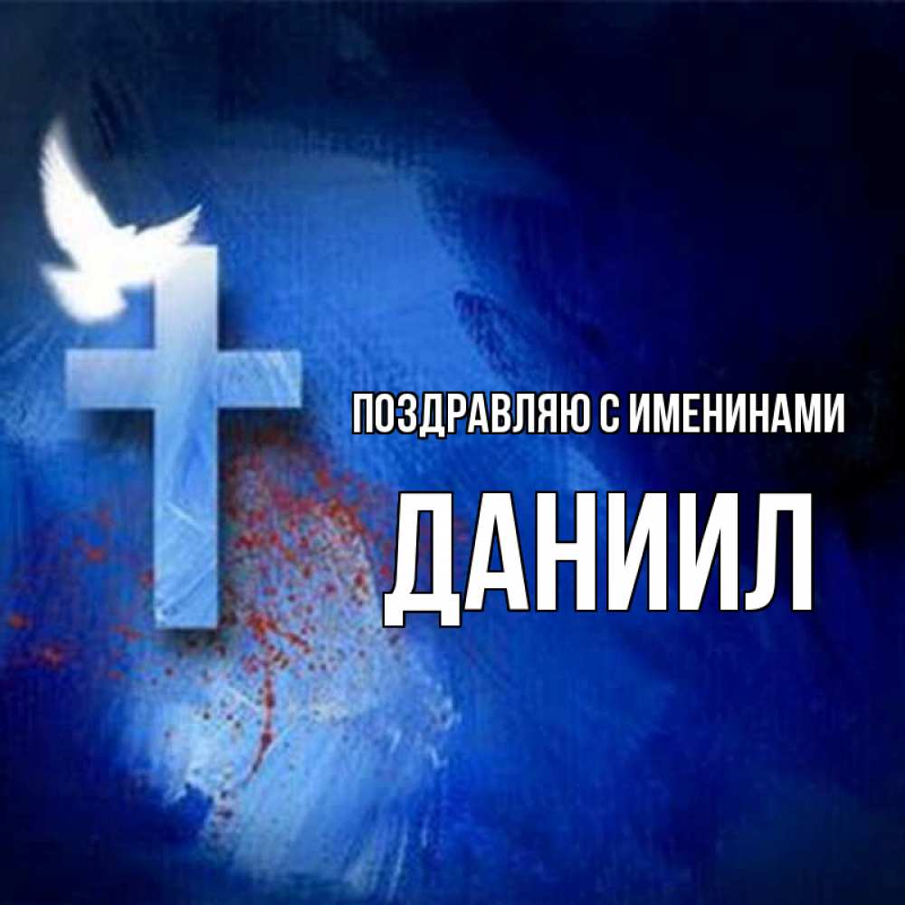 Открытка Поздравляю с именинами Даниил. Голубь и крест. Синий фон и птица