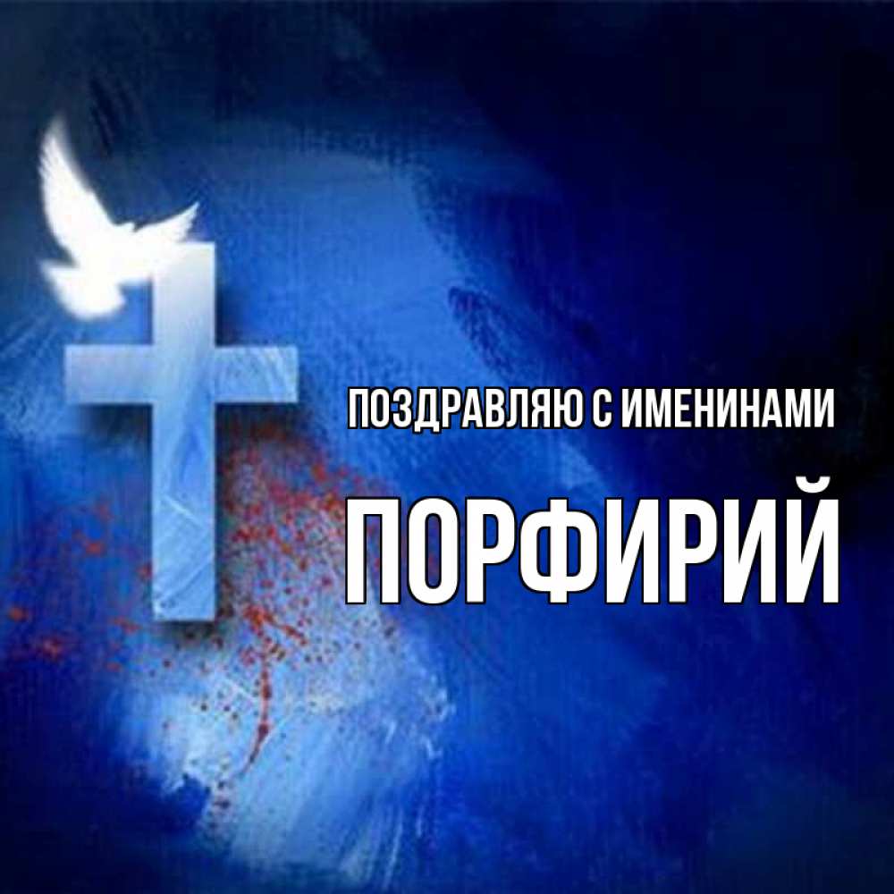 Открытка Поздравляю с именинами Порфирий. Голубь и крест. Синий фон и птица