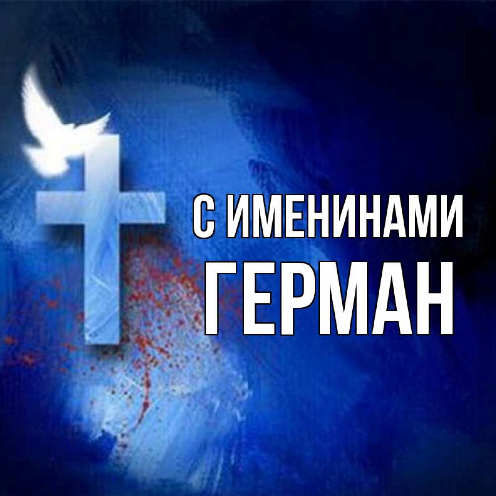 Открытка С именинами Герман. Голубь и крест. Синий фон и птица