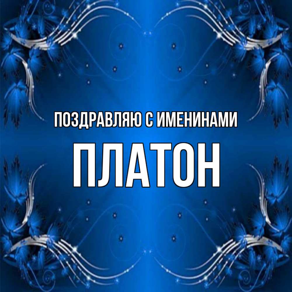 Открытка Поздравляю с именинами Платон. Рамочка с узорами синебелая. красивая рамочка с узорами